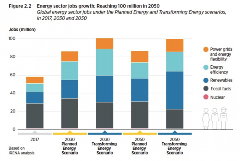 《展望》中揭示,盡管深入脫碳需要的能源投資總額高達(dá) 130 萬億美元,但其帶來的社會(huì)經(jīng)濟(jì)收益也非常豐厚。 從現(xiàn)在到 2050 年,與目前的能源系統(tǒng)相比,能源系統(tǒng)轉(zhuǎn)型可以刺激全球 GDP 累計(jì)增加 98 萬億美元。 可再生能源相關(guān)工作崗位將增至約四倍, 達(dá)到 4,200 萬個(gè),能源效率相關(guān)工作崗位增加到 2,100 萬個(gè),系統(tǒng)靈活性相關(guān)工作崗位 增加到 1,500 萬個(gè)。