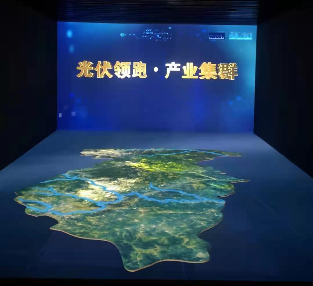 該區(qū)域?yàn)?2臺(tái)投影機(jī)投射出的L型裸眼3D沙盤(pán),展出了,鐵路和公路交通圖,礦產(chǎn)區(qū)域分布情況;以及“光伏領(lǐng)跑 綠色發(fā)展”主題影片,一同感受陽(yáng)泉光伏領(lǐng)跑者示范基地一路走來(lái)的光輝歷程。