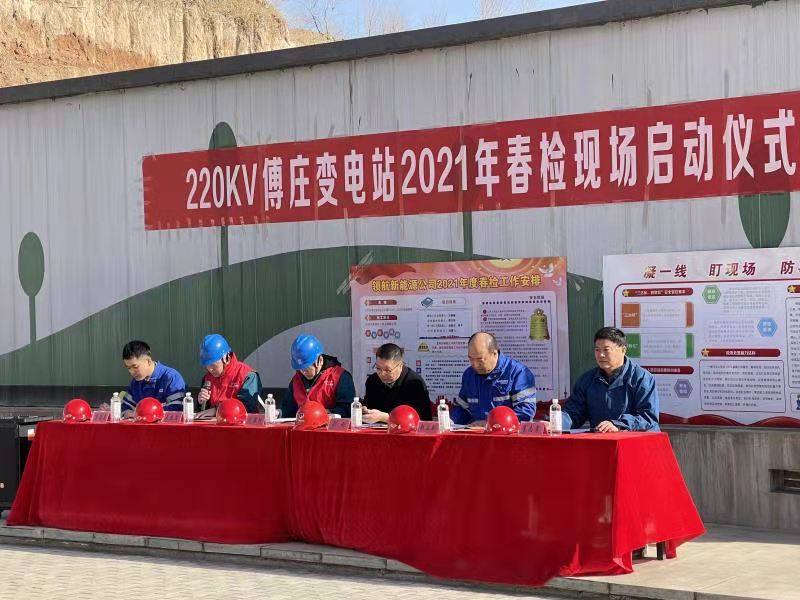2021年3月23日上午9時,領航新能源有限公司黨支部書記、董事長趙立新、總經理李勃燾同聚源電力實業(yè)公司總工郝利、聚源電力實業(yè)公司運檢分公司總經理劉雪軒、聚源電力實業(yè)公司運檢分公司總經理王燕鑫、聚源電力實業(yè)公司運檢分公司技術專責李志孝,在傅莊進行“2021年春檢現(xiàn)場啟動儀式”做動員講話。
